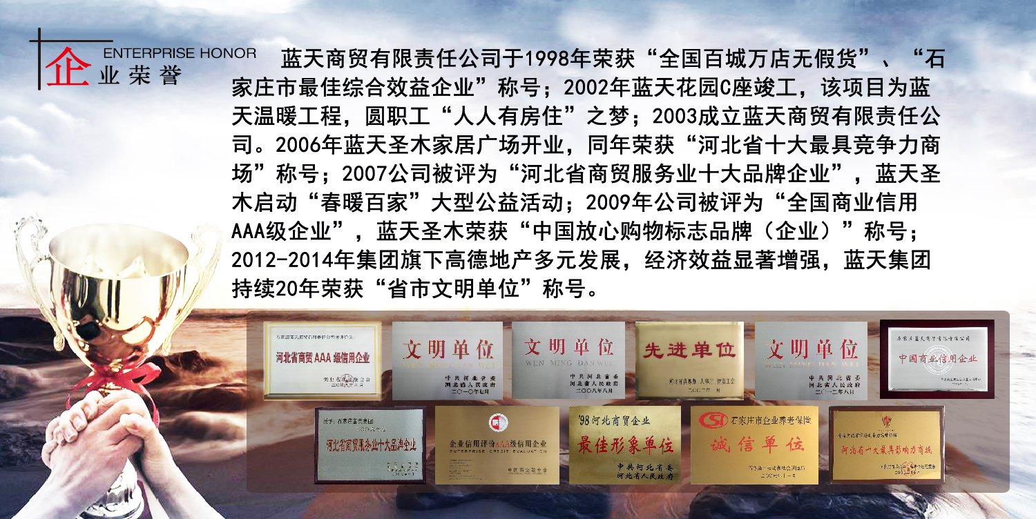 石家莊藍天商貿(mào)有限責(zé)任公司,成立于1992年10月28日,前身是石家莊長安五交化公司,目前旗下包含藍天圣木家居廣場、藍天奧特萊斯、藍天五交化商場、藍天高德房地產(chǎn)4家子公司。 藍天圣木家居廣場是省會大型中高檔家居賣場之一,賣場經(jīng)營面積3萬多平方米,位于省會黃金地段,是省會重...